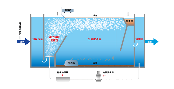 孢子轉(zhuǎn)移技術(shù),是將混凝技術(shù)、氣浮技術(shù)與微納米孢子相結(jié)合,通過定制化藥劑、微納米氣泡與水中的磷、疏水基懸浮物發(fā)生反應(yīng),創(chuàng)新形成的一種高效物理化學處理方法。主要解決了目前常用溶氣氣浮技術(shù)在應(yīng)用過程中存在的處理效率較差、表面負荷較低、處理能耗較高、應(yīng)急機動性不強等問題。